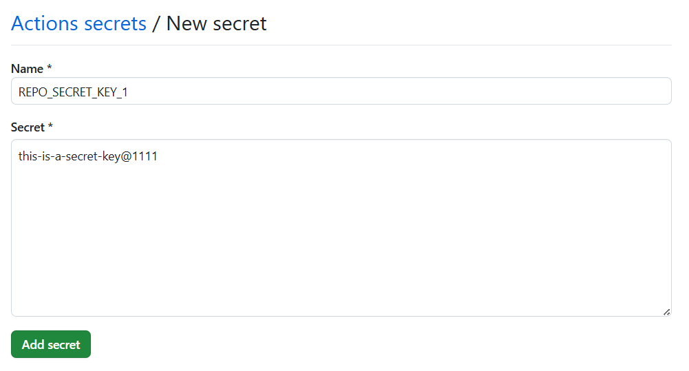 Now, fill in the Name (name of the secret key) and the Secret (value of the secret key), and click on the Add secret button.